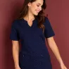 Zwei geräumige Seitentaschen sowie eine praktische Handytasche bieten ausreichend Platz für alle wichtigen Utensilien wie Piepser, Stift oder Smartphone. Besonders clever: Die Taschen sind farblich in Weiß geriegelt – ein kleines Designhighlight mit Funktion. Der hochgeschlossene Ausschnitt schützt vor ungewollten Einblicken, während der geschwungene Halsausschnitt feminin wirkt und ein angenehmes Tragegefühl vermittelt. Die Ärmel sind so gestaltet, dass sie ausreichend Bewegungsfreiheit lassen, aber gleichzeitig für ein gepflegtes Erscheinungsbild sorgen. Dank der Seitenschlitze bleibt der Kasack auch bei viel Bewegung stets in Form und engt Sie nie ein.