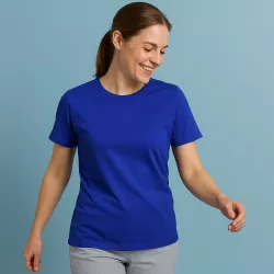 Das T-Shirt bietet dank 100 % Baumwolle ein sehr hautfreundliches, atmungsaktives Tragegefühl – ideal für Pflegende, die oft mehrere Stunden am Stück körperlich aktiv sind. Baumwolle wirkt temperaturausgleichend und reduziert das Schwitzen spürbar, selbst bei hohem Arbeitspensum. Die weiche Stoffqualität mit einem Gewicht von 160 g/m² liegt angenehm leicht auf der Haut, ohne dabei zu dünn oder instabil zu wirken. Der runde Halsausschnitt mit verstärktem Rippabschluss sorgt für Flexibilität beim An- und Ausziehen und bietet Bewegungsfreiheit ohne einzuengen. In Summe entsteht ein hoher Tragekomfort – gerade bei Tätigkeiten, bei denen Funktion und Wohlfühlfaktor gleichermaßen zählen.